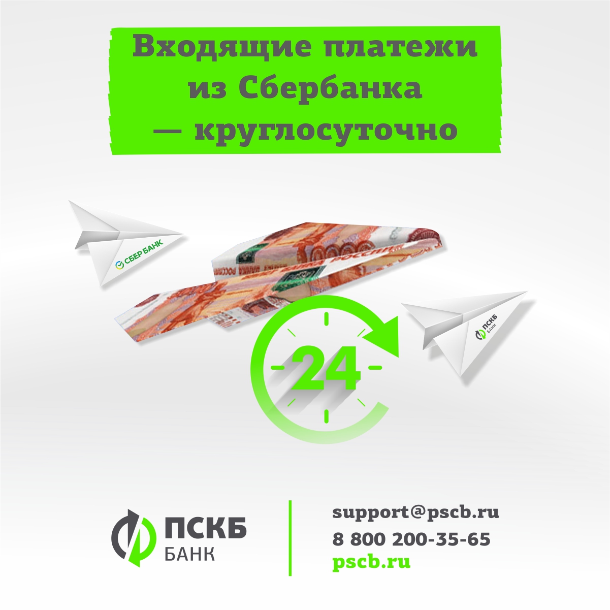 С 19.02.2022 г. входящие платежи в рублях от ваших контрагентов из ПАО Сбербанк зачисляются на счета в АО Банк «ПСКБ» круглосуточно, в том числе в выходные, праздничные и нерабочие дни.